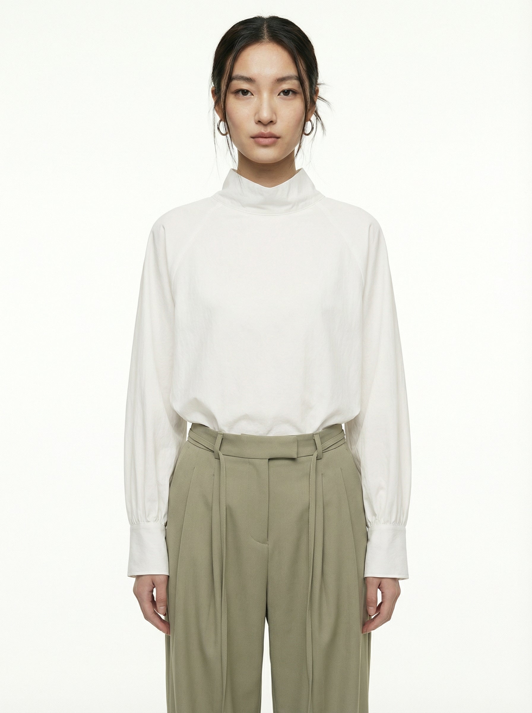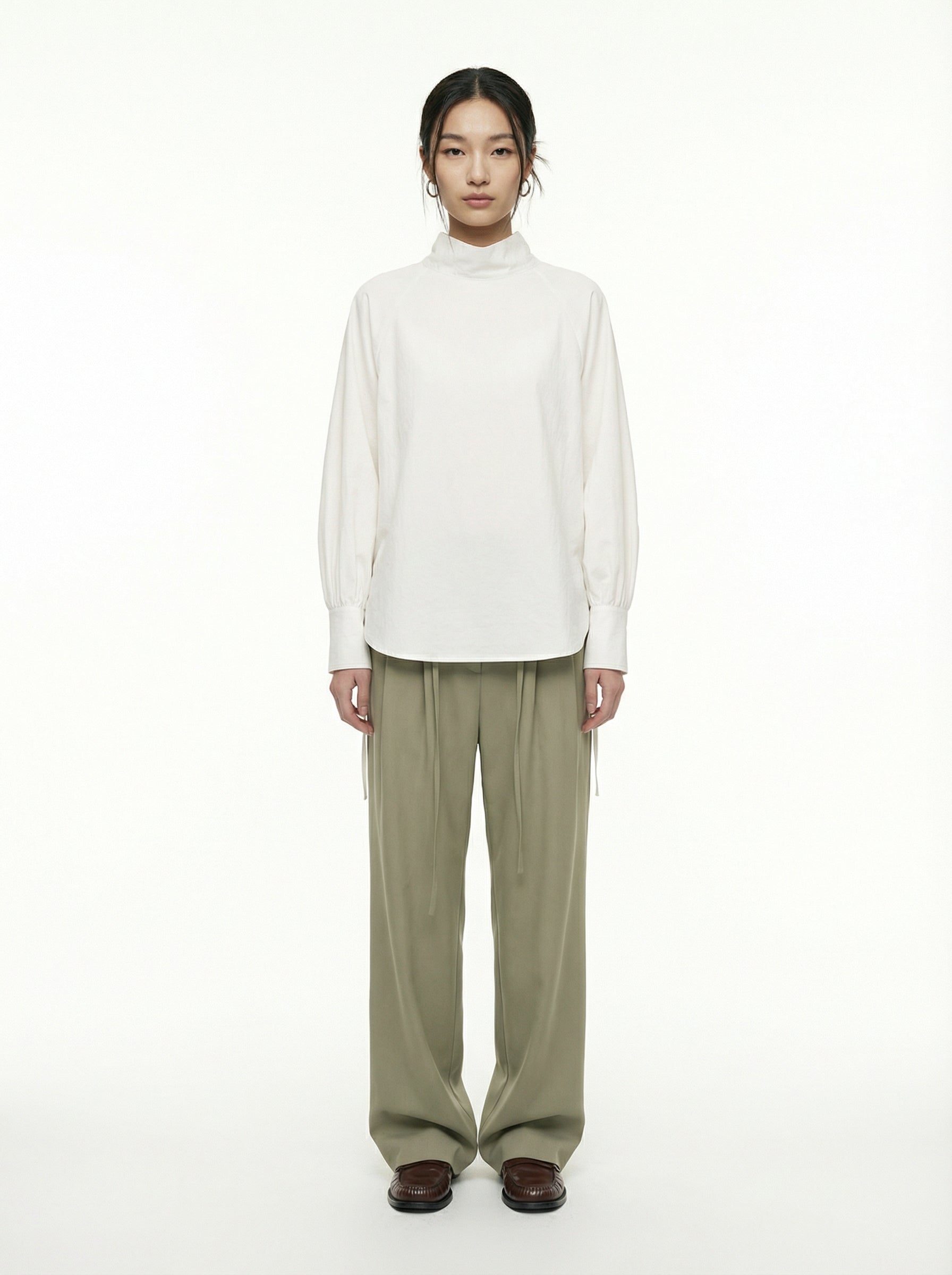 This high-neck blouse features a trendy silhouette designed for versatile two-way wear, allowing it to be styled with either side facing forward. Crafted from a firm yet soft polyester fabric, it offers a comfortable fit with a refined aesthetic. The design is elevated by voluminous sleeves with buttoned cuffs and a waist drawstring that allows for a customized, adjustable fit.