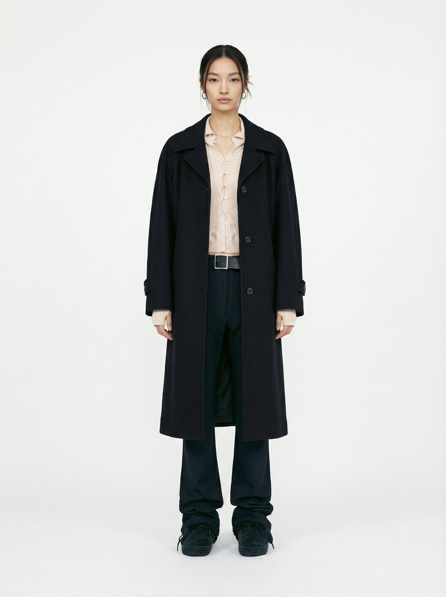 This refined single-breasted coat is crafted from 100% wool and designed with a relaxed raglan sleeve silhouette for effortless structure. Thoughtful tailoring details at the sleeves and back enhance movement, while angled welt pockets add a clean, functional finish. Completed with natural horn buttons engraved with the LC logo, the design reflects a timeless approach to Korean outerwear craftsmanship.